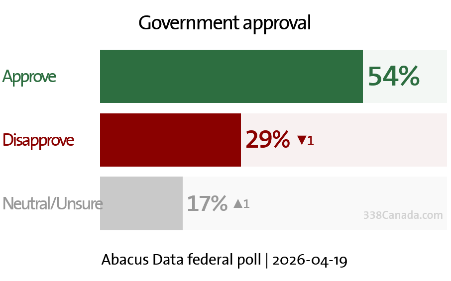 Abacus’ government approval tracker continues to show strong numbers for the Mark Carney government: 54% approve, compared to 29% who disapprove—a net +25.