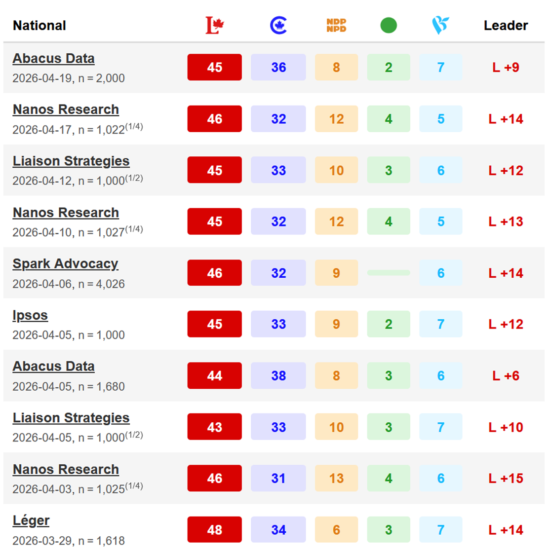 Compared to Nanos’ previous four-week wave (ending March 20), the numbers are essentially unchanged. The prior wave (ending February 20) had the Liberals ahead by seven points—suggesting the current gap has both widened and stabilized.
