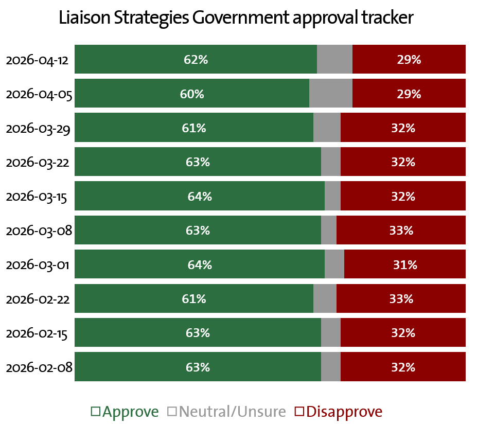 Liaison’s approval tracker is even more bullish on the government, measuring 62% approval against 29% disapproval—a net +33.