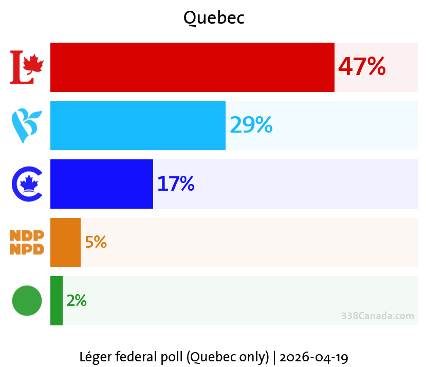 Last week’s Quebec poll from Léger included federal numbers and showed a comfortable Liberal lead in the province: 47% for the LPC, 29% for the Bloc, and 17% for the Conservatives.