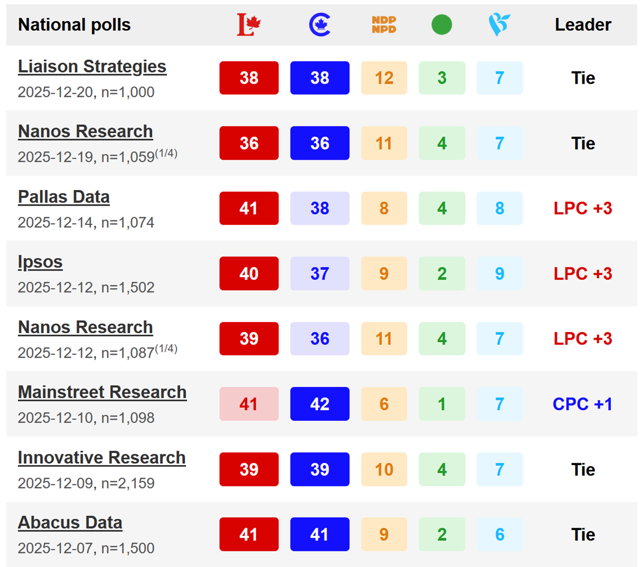 Among federal polls fielded in mid-December, Mainstreet Research measured a one-point Conservative lead; Nanos Research and Liaison Strategies both reported dead heats (38–38 from Liaison; 36–36 from Nanos); while Pallas Data and Ipsos closed the year with a three-point Liberal advantage.