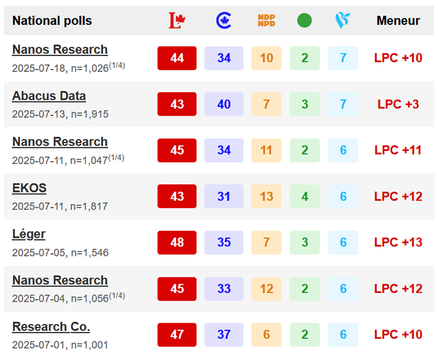 Summer polling thus far has not been kind to the Conservatives. While Abacus Data did measure a closer contest earlier this month (43% Liberal, 40% Conservatives), other firms—Nanos Research, Léger, Research Co., and EKOS—have all given the Carney Liberals a double-digit national lead over the Poilievre Conservatives in July (see table below):