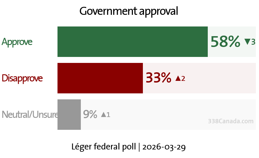 Léger’s tracker showed a modest erosion in government approval, but the numbers remain comfortably in positive territory. Nationally, 58% of respondents approve of the performance of Mark Carney’s federal government (–3 since early March), against 33% disapproval (+2)—a net +25, down from +30 last month.