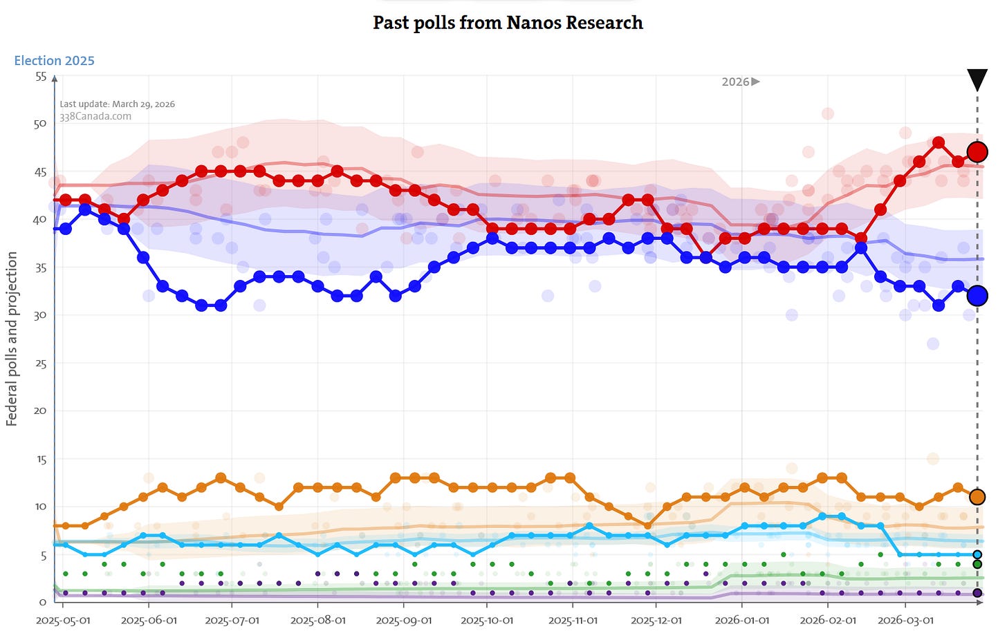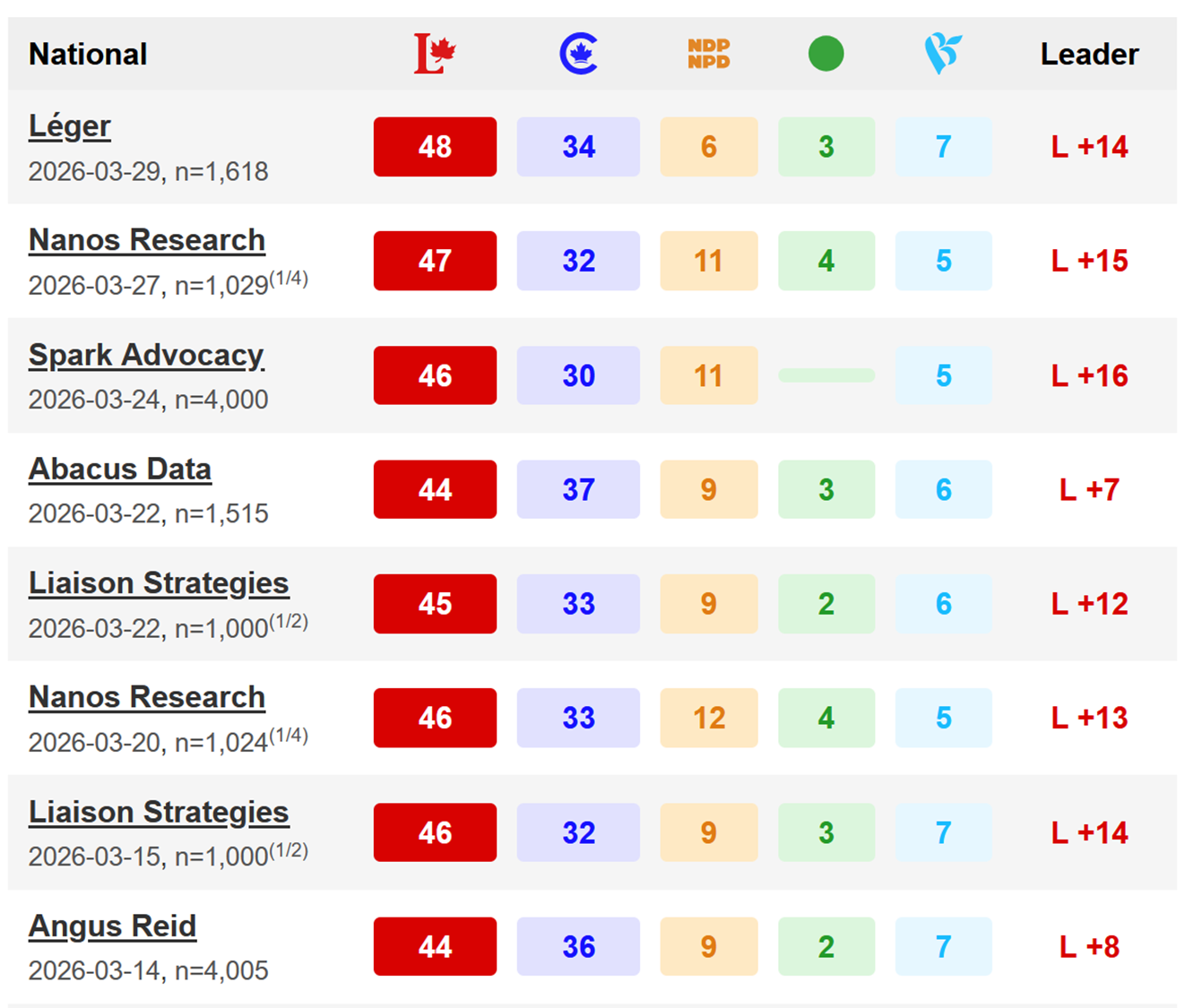 We are seeing a rather healthy spread in the national horse race. Since mid-March, Mark Carney’s Liberals have polled between 44% and 48% nationally, while Conservative support has ranged from 30% to 37%.