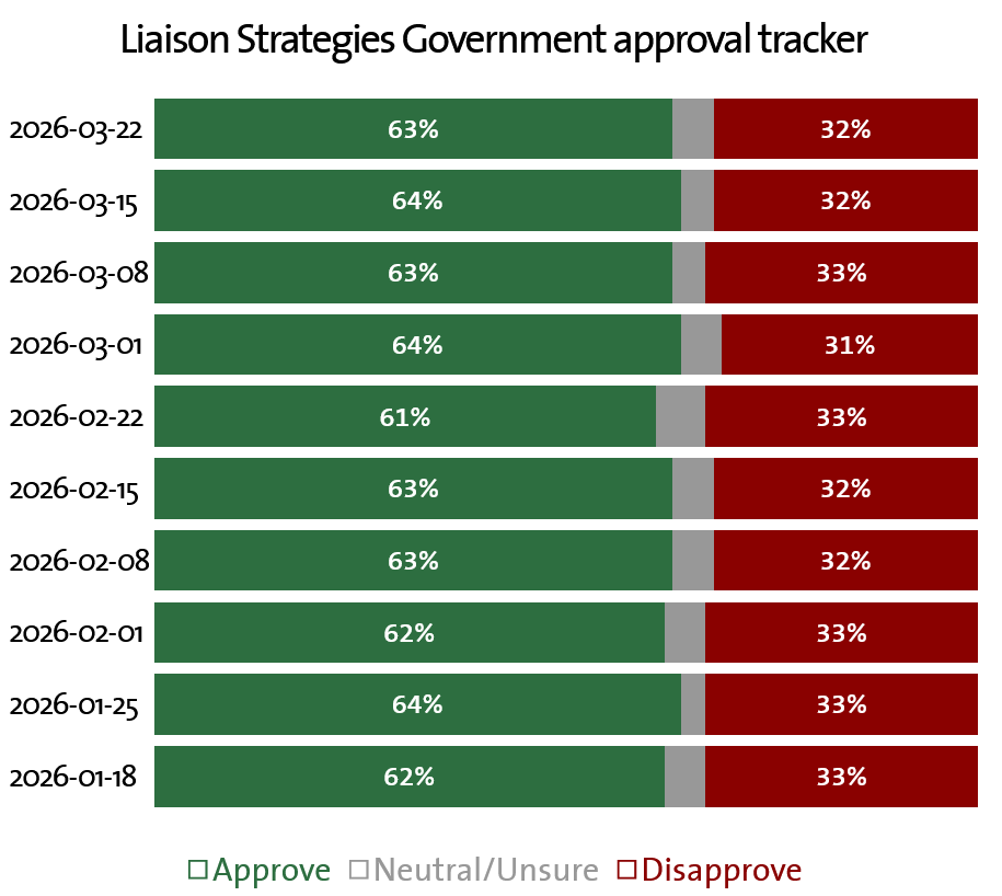 Liaison’s approval tracker has shown remarkable stability since the new year. Last week’s update measured 63% approval, against 32% disapproval—a net +31.