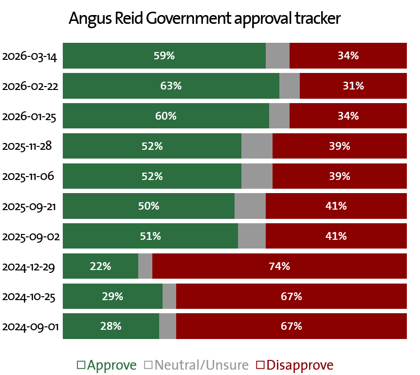 Approval of Mark Carney’s government remains comfortably in positive territory, though the numbers have eased slightly. According to ARI, 59% of respondents approve of the government’s performance, compared to 34% who disapprove — a still-enviable net rating of +25, albeit down from +32 last month.