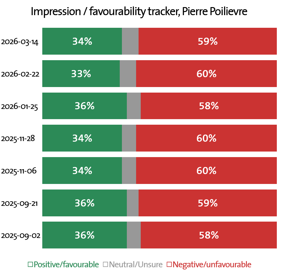 Impressions of Pierre Poilievre have remained remarkably consistent in ARI polling since the election. This month’s 34% favourable rating falls well within his range since September. Nationally, 59% view Poilievre unfavourably, giving the Conservative leader a net favourability score of -25.