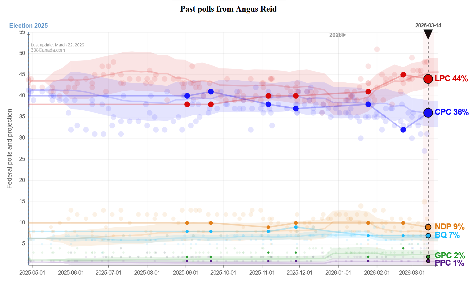 Federally, this large-sample ARI poll places the Mark Carney Liberals at 44% nationwide, eight points ahead of the Poilievre Conservatives at 36%. Regionally, the Liberals lead in Ontario by 11 points, in Quebec by 13 points (over the Bloc), and in British Columbia by six points.