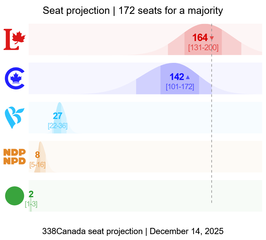 The updated 338Canada projection has tightened modestly. We stress modestly, as the numbers remain within the same general range as recent updates. The Liberals continue to lead with an average of 164 seats, while the Conservatives trail not far behind, averaging 142 seats.