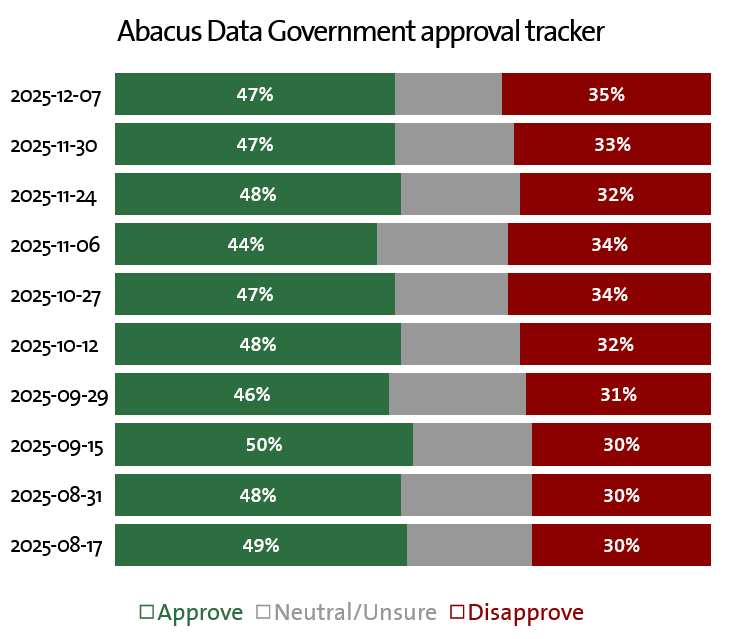 Government approval remains above water in Abacus’ latest release: 47% approve of the federal government’s performance, while 35% disapprove. Approval has eroded slowly since the summer in Abacus’ numbers, but the Liberals appear poised to end the year with net-positive ratings.