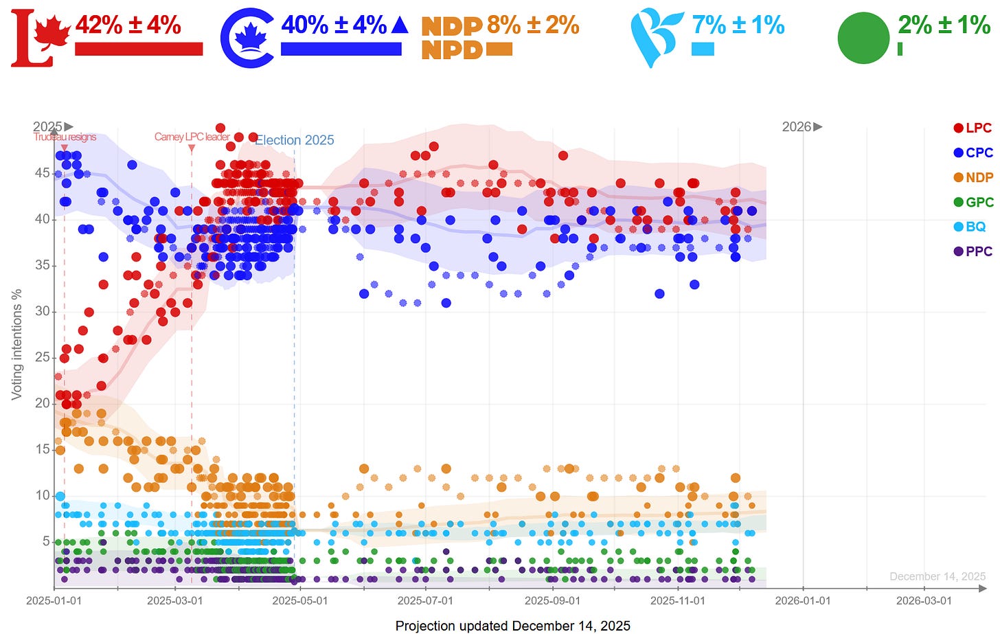 Last week saw the House rise for the holidays, a round of high-drama Christmas parties, and (yet) another floor-crossing from the Conservatives to the Liberals. Thankfully for my sake, it was a quiet week in the polls. So let’s get right to it.