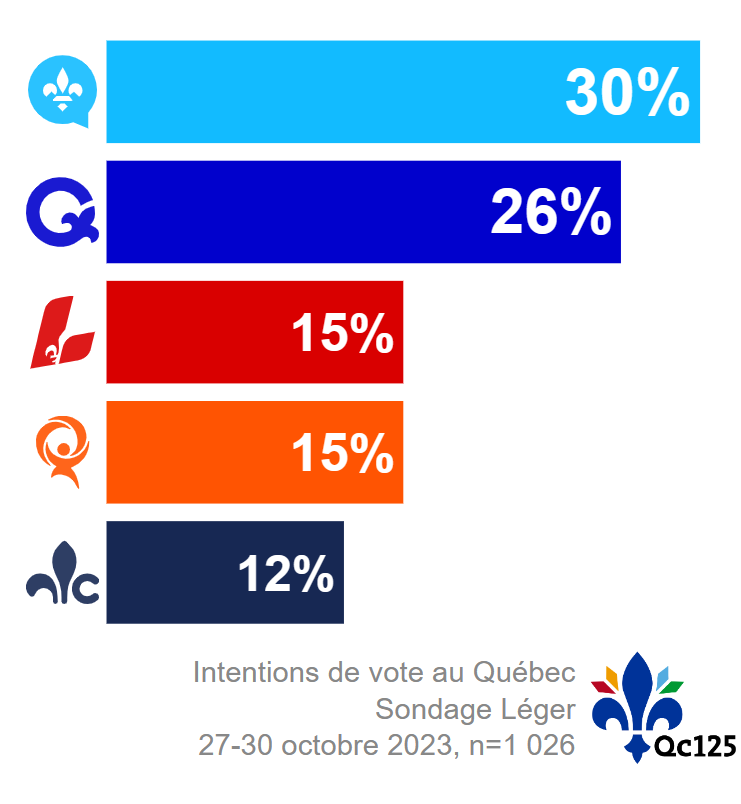 According to Léger, if an election had been held last week, the CAQ would have gotten 30% of voting intentions province-wide, a loss of 4 points since September and a stunning 11 points since the October ‘22 general election.