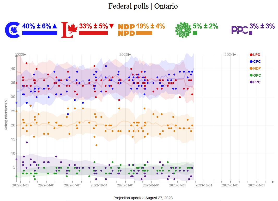 These polls came after Léger, Abacus Data, and the Angus Reid Institute measured 7- to 10-point leads for the Conservatives in July and early August. As for the Nanos weekly tracking (details not discussed here to respect Nanos’ paywall), it fell generally within the same ranges all summer long, except for last week’s update which saw a modest tightening of national numbers (CPC 34, LPC 30).
