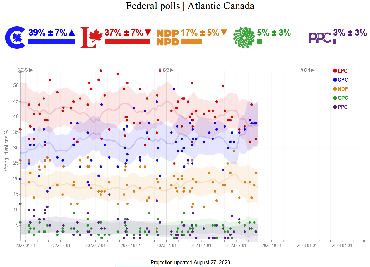 Meanwhile the Conservatives have increased their support where they most needed it, with better numbers in Atlantic Canada and Ontario. Below are the current averages in Atlantic Canada. As I have emphasized before however, those can be especially noisy since sample sizes for these provinces are generally low, leading to a much higher uncertainty.