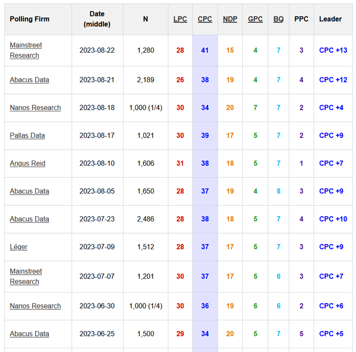 Last week, polling from Pallas Data (new firm founded by Joseph Angolano), Abacus Data, and Mainstreet Research (see complete list of federal polls here) added to the downward trend for Liberals, while each survey gave the Poilievre Conservative Party hefty national leads of 9 to 13 points.
