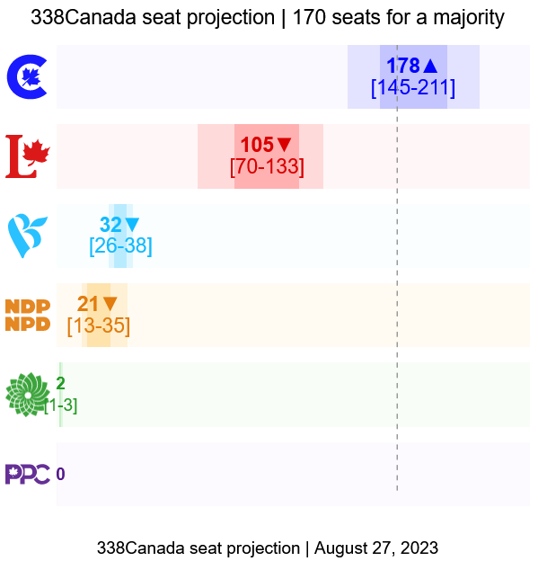 And so, for the first time since the height of the SNC-Lavallin affair in 2019, the Conservatives find themselves in majority territory in the weekly 338Canada projections.