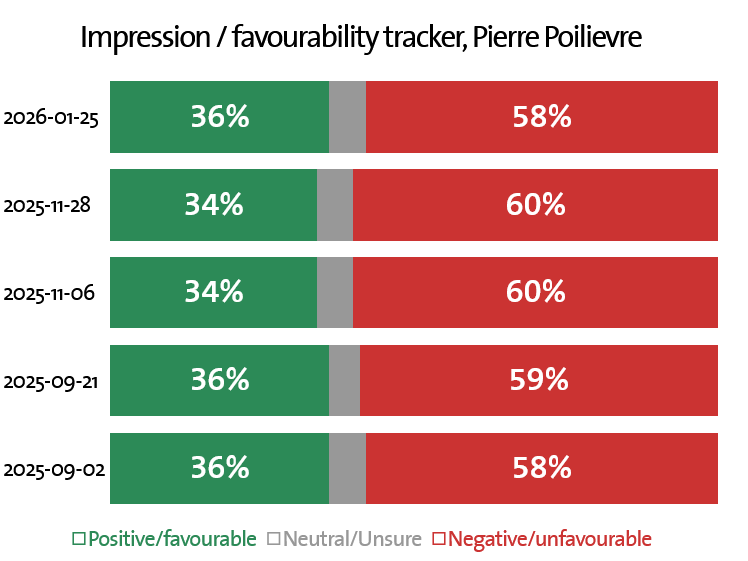 Asked whether they hold an overall favourable or unfavourable view of Pierre Poilievre — Opposition leader and leader of the Conservative Party of Canada — 58% of respondents expressed an unfavourable opinion, compared with 36% who said favourable. That translates into a net favourability rating of −22.