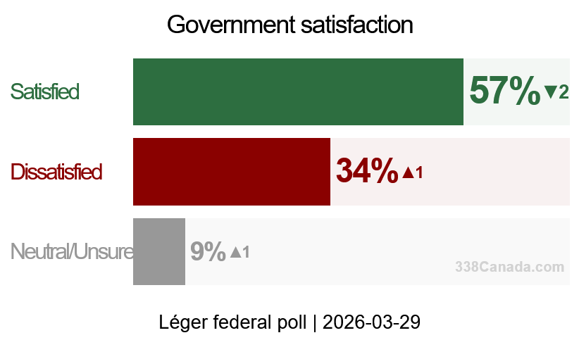 Satisfaction with the federal government remains high, though it has eased slightly: net satisfaction now stands at +23, down from +26 in Léger’s previous release. In this latest survey, 57% of respondents said they are satisfied with the federal government, compared to 34% who are dissatisfied.