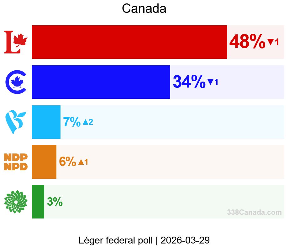 Nationally, the Liberals stand at 48% support (−1 since Léger’s previous poll in early March). The Conservatives trail by 14 points at 34% (also −1).