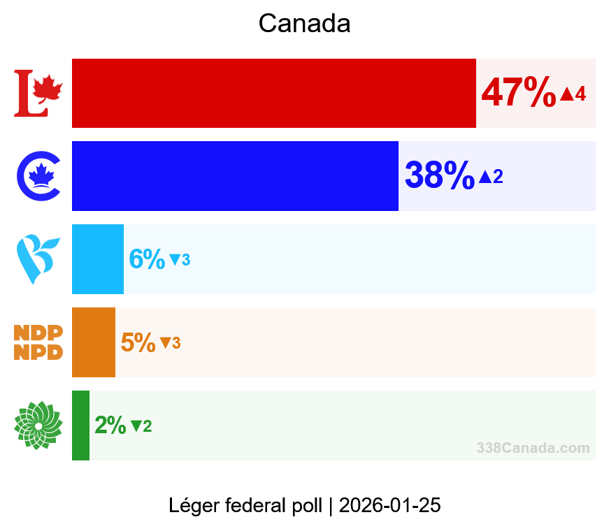 From coast to coast, Léger finds Mark Carney’s Liberals at 47% support among decided voters, up four points since Léger’s previous poll back in December. And this newfound support for the Liberals does not come at the expense of the Conservatives, who sit at 38%, themselves up two points.
