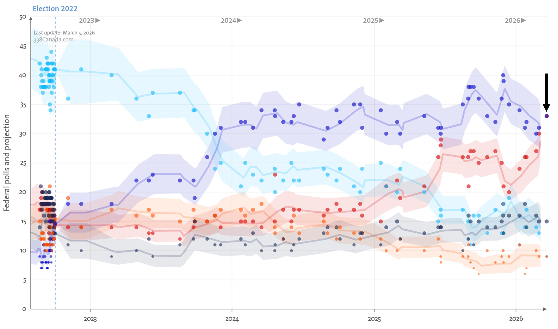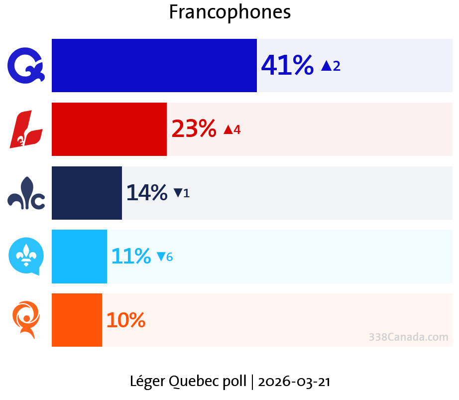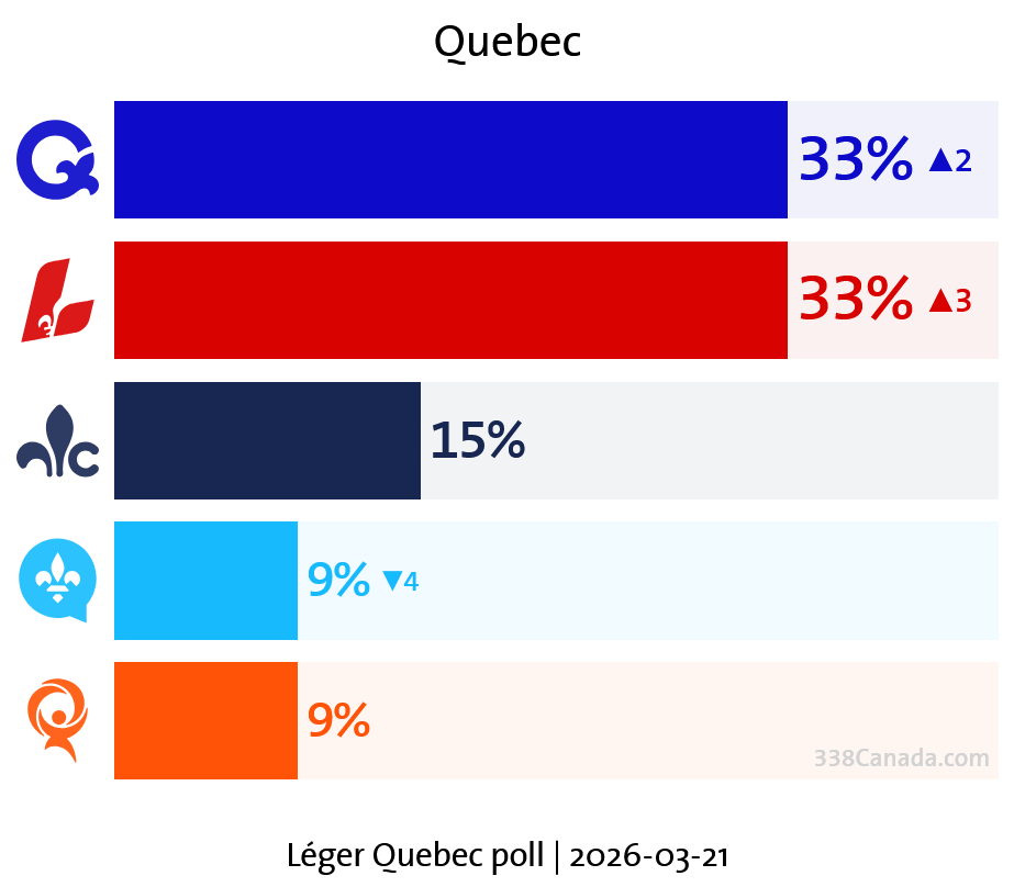Léger’s latest Quebec survey, conducted from March 20 to 22, 2026, places the PQ and the Quebec Liberals at 33% apiece among decided voters.