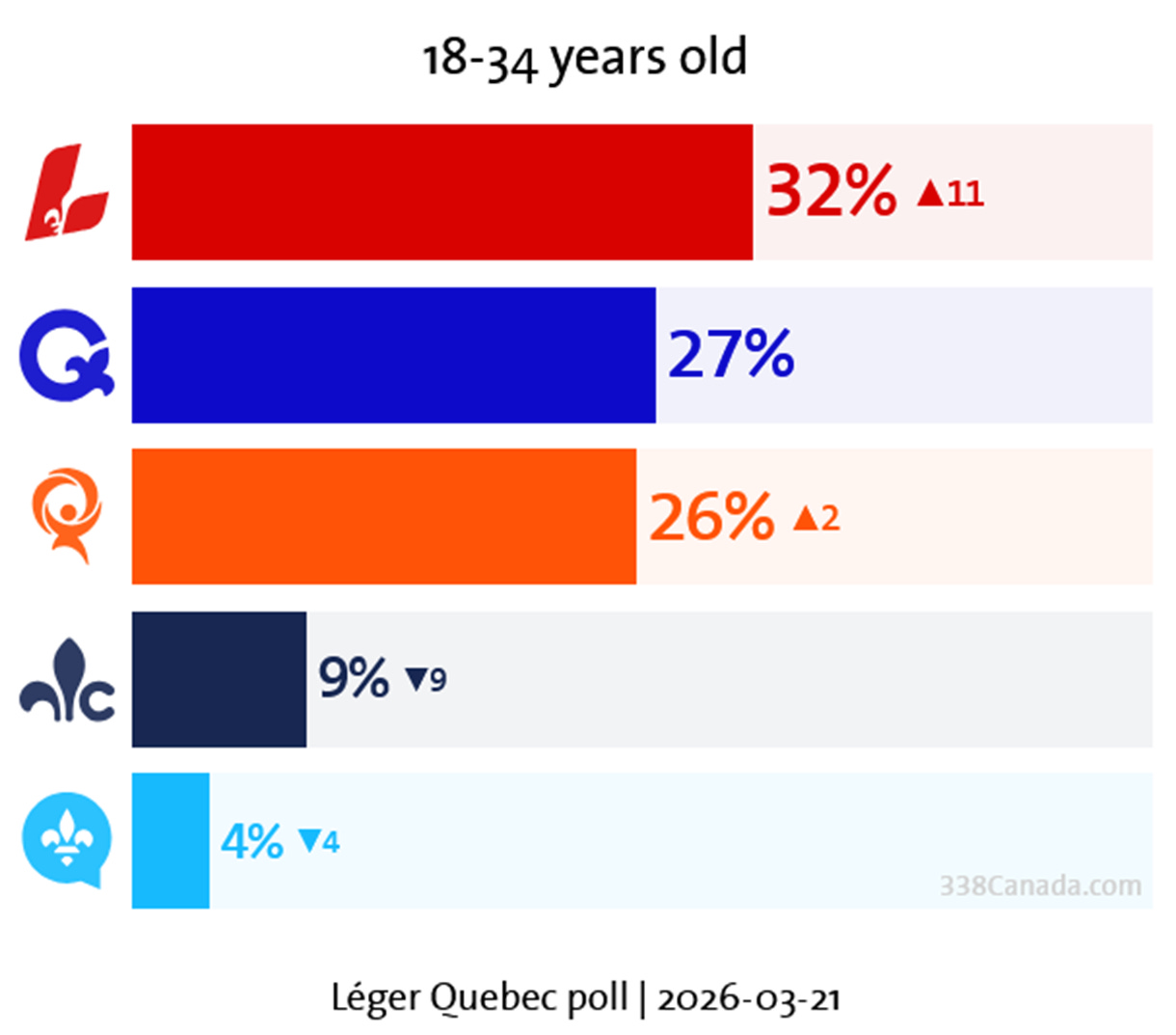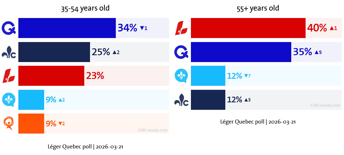 The PQ leads among voters aged 35 to 54 with 34% support, nine points ahead of the Conservatives and 11 points ahead of the Liberals. Among voters aged 55 and over, Léger measures a close race between the Liberals (40%) and the PQ (35%).