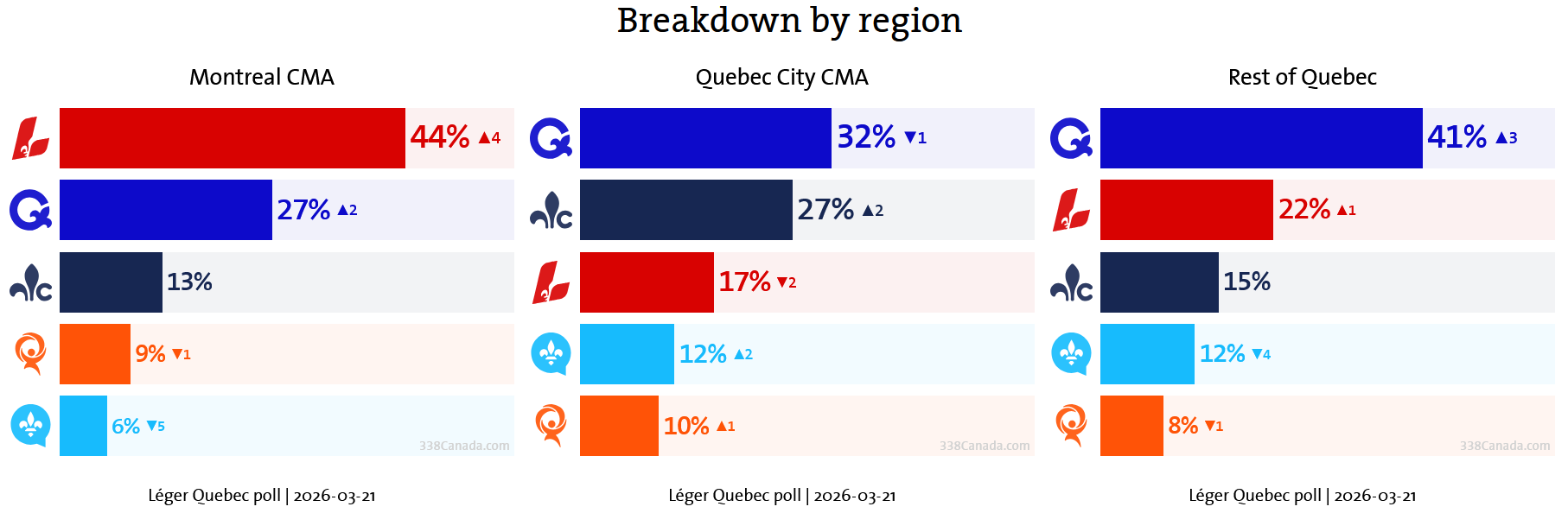 The regional breakdown is consistent with recent polls and highlights deep divides between the Montreal metropolitan area and the rest of the province. In Greater Montreal (island and suburbs), the Liberals lead by 17 points over the PQ, 44% to 27%. In the Quebec City region, results have not moved beyond the margin of error, and the race remains tight between the PQ and the Conservatives.
