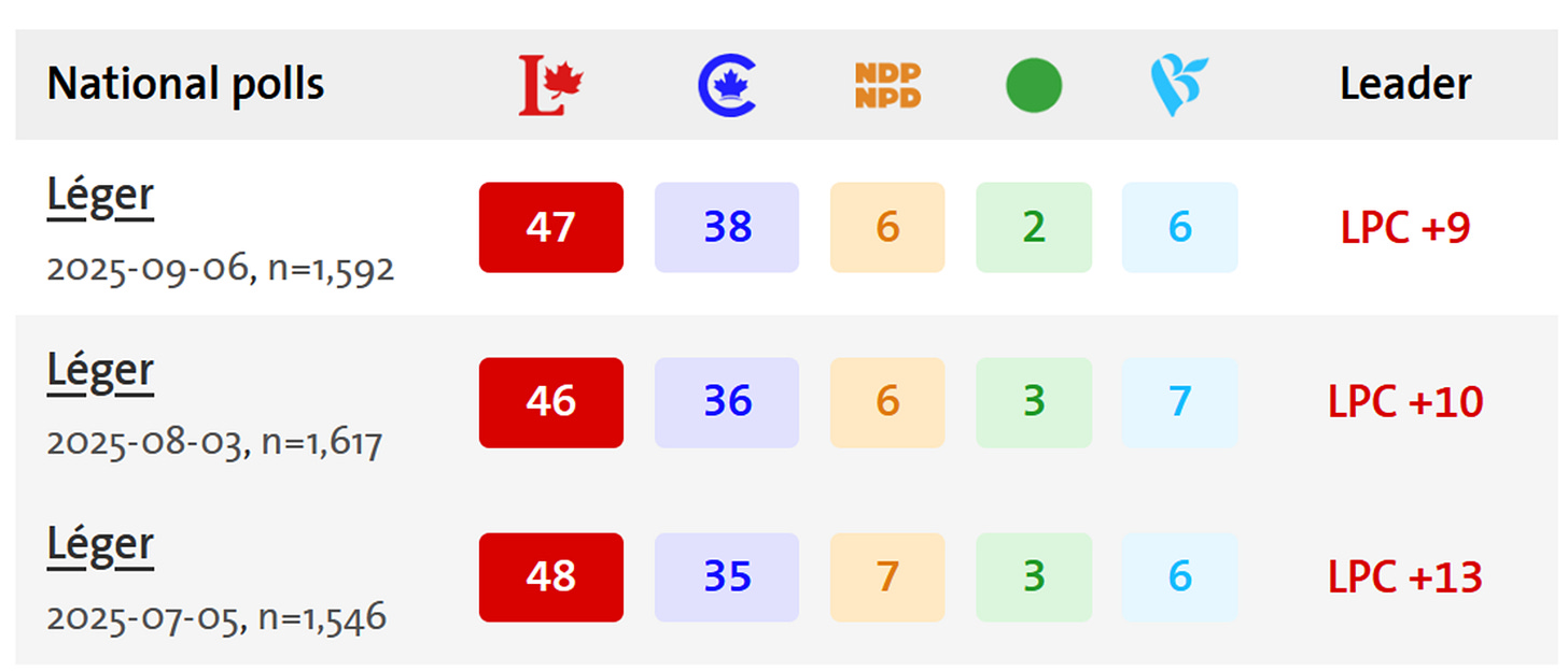 According to Léger (fielded September 5–7, n=1,592), the Carney Liberals stand at 47% (+1 since August), while the Conservatives trail at 38% (+2).