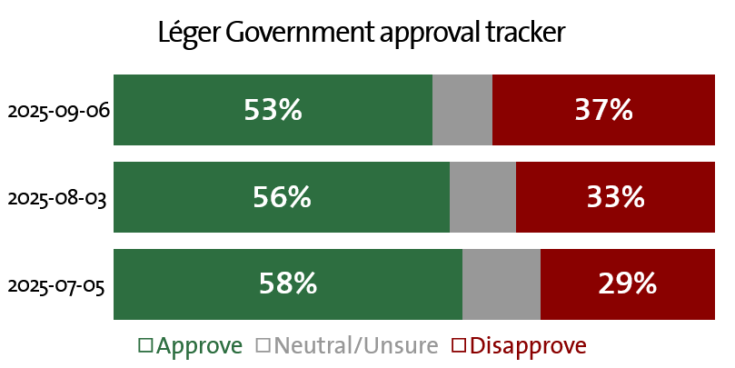It is also worth stating that Léger sees a modest downtick of government approval in this newest poll: 53% approve, 37% disapprove. Net of +16. These numbers (and their trend) match what Abacus Data and ARI have released lately.