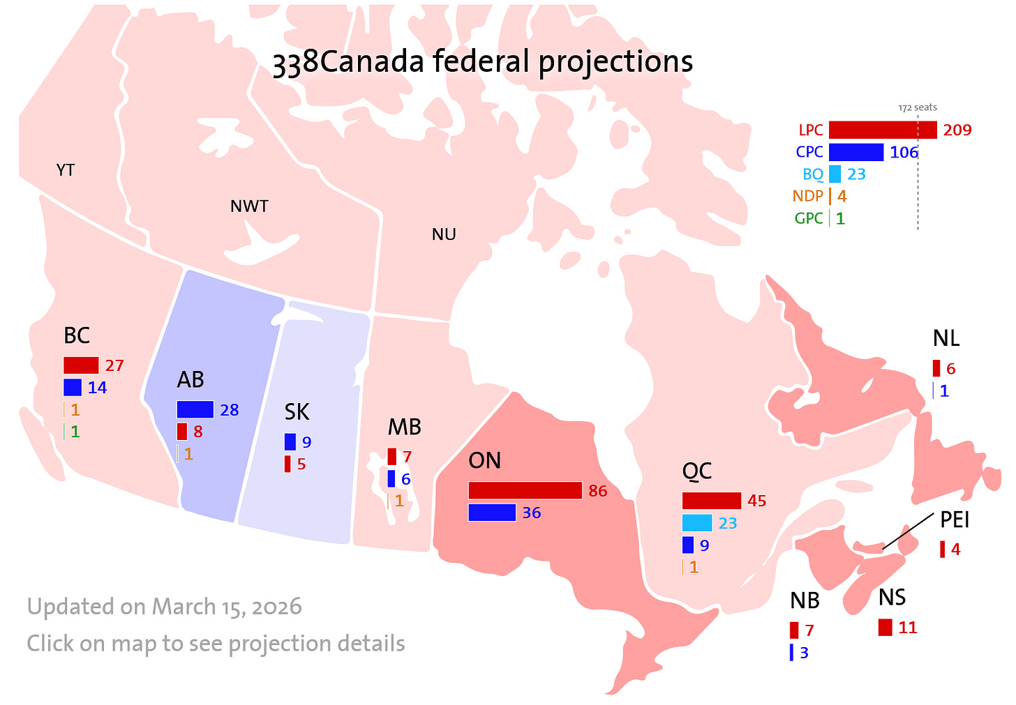 On Sunday, the 338Canada projection update placed the Liberals at their highest level since the launch of 338 nearly a decade ago, with an average of 209 seats from coast to coast—more than 100 seats ahead of the Conservatives, whose projection stood at 106.