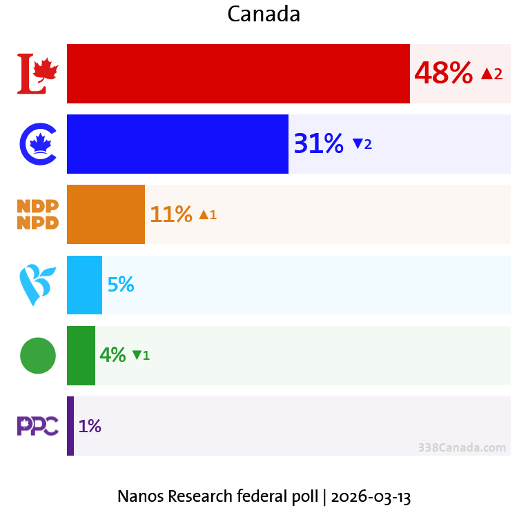 With data fielded over the past four weeks (February 20 to March 13, 2026), the Liberals climb to 48% in vote intention, compared to 31% for the Conservatives—an unusual 17-point gap between the two main parties. The NDP remain a distant third at 11%.