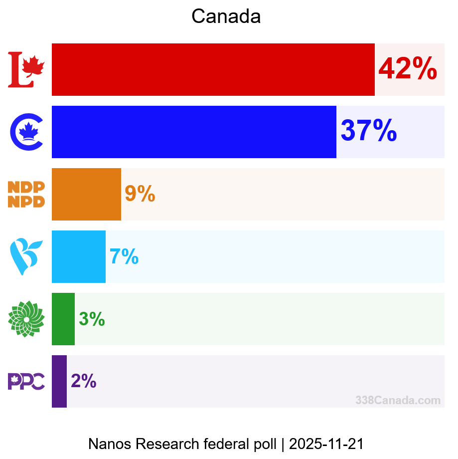 Based on interviews collected between October 31 and November 21, 2025, Nanos now places the Liberals at 42 per cent nationally — closely aligned with the current 338Canada weighted average — compared with 37 per cent for the Conservatives. The NDP slips to 9 per cent, the first time the party has fallen into single-digit support in the Nanos tracker since last spring.