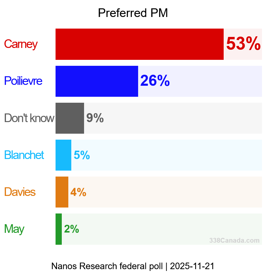 On the preferred PM tracker, Mark Carney has expanded his lead over the past month. The prime minister now stands at 53 per cent — up four points since the previous four-week sample.