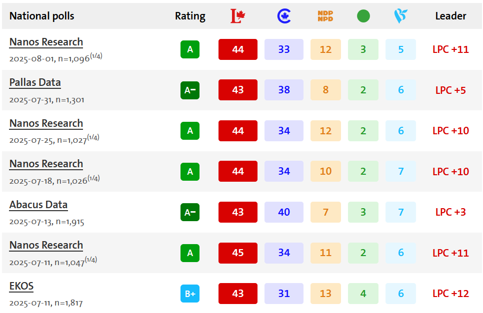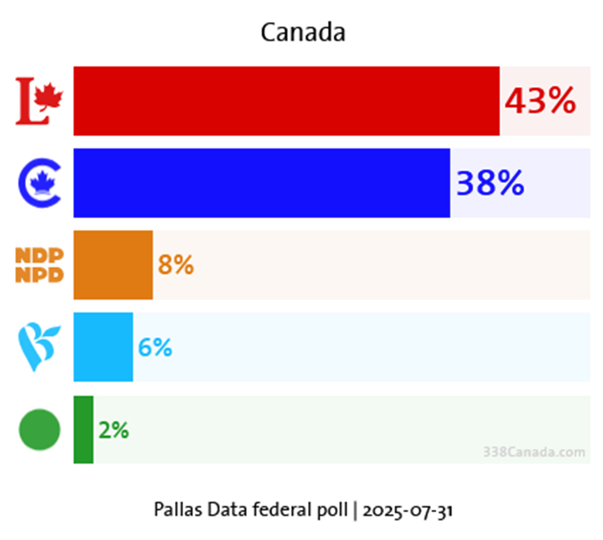 The survey, conducted from July 29 to August 1 with a total sample of 1,301 Canadian respondents, places the Carney Liberals at 43% nationally among decided and leaning voters—essentially unchanged from the party’s 43.8% share in April.