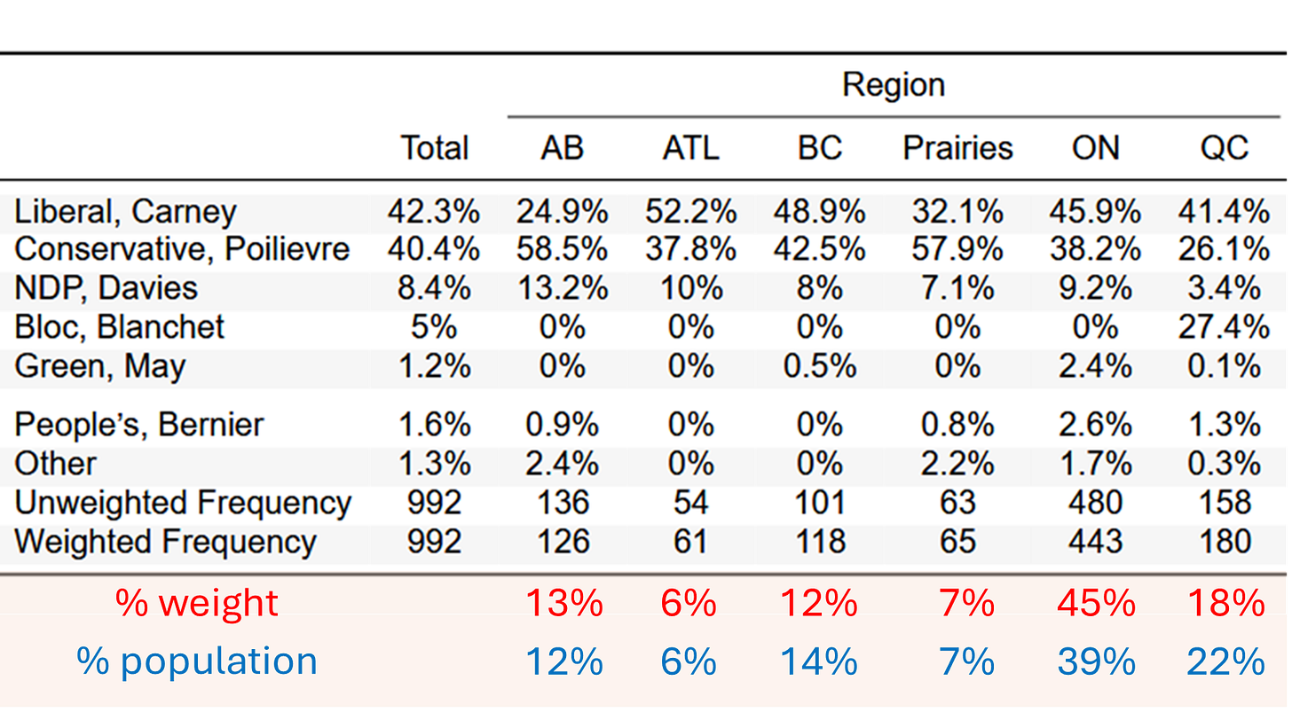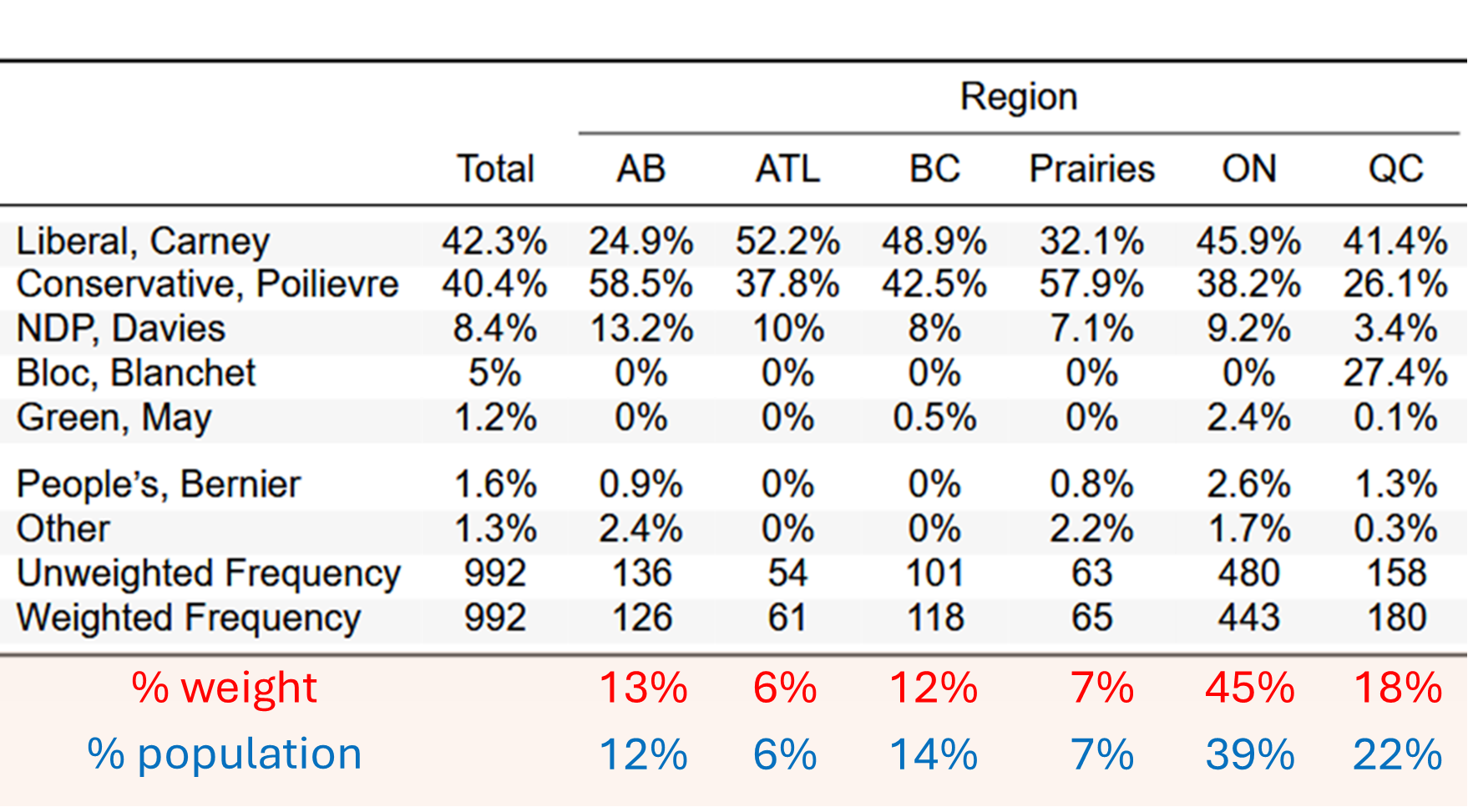A not of caution however: Mainstreet’s regional weights differ from the both the 2021 census (which admittedly is a bit dated) and the Statistics Canada quarterly population estimates.
