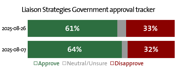 Government approval remains strong in Liaison’s numbers: 61% of respondents approve of Mark Carney’s government, against 33% who disapprove—an enviable net rating of +28. See all the numbers from this Liaison poll here.